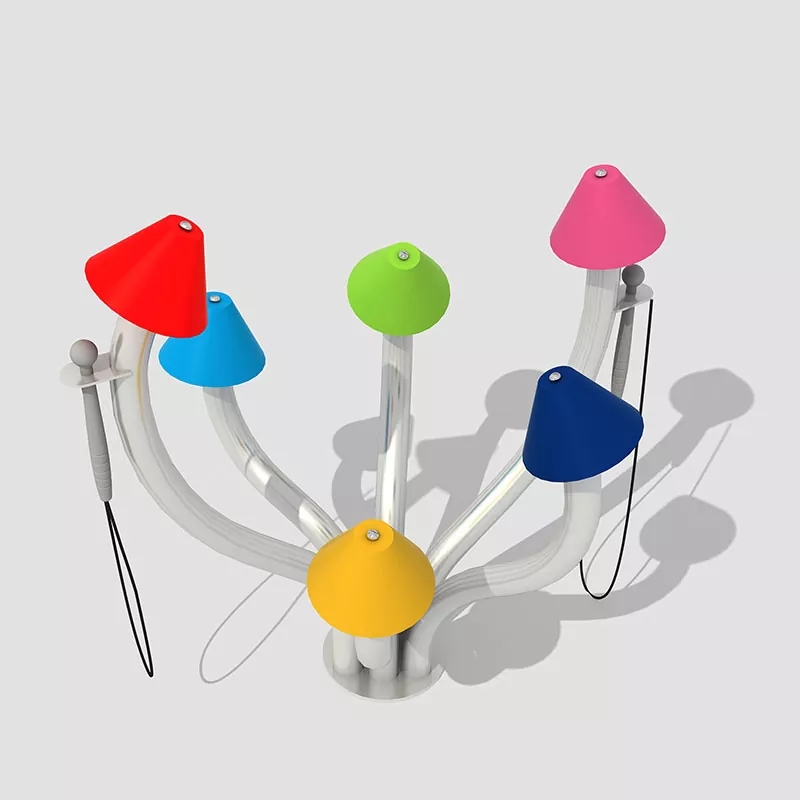 مجموعه ای از شش "کلاه" مخروطی شکل پودری با رنگ های زنده، دارای میله های فولادی زنگ نزن راه راه در ارتفاعات و زوایای مختلف، که آن را به عنصری چشمگیر تبدیل می کند که به زودی محبوب ترین خواهد شد.
