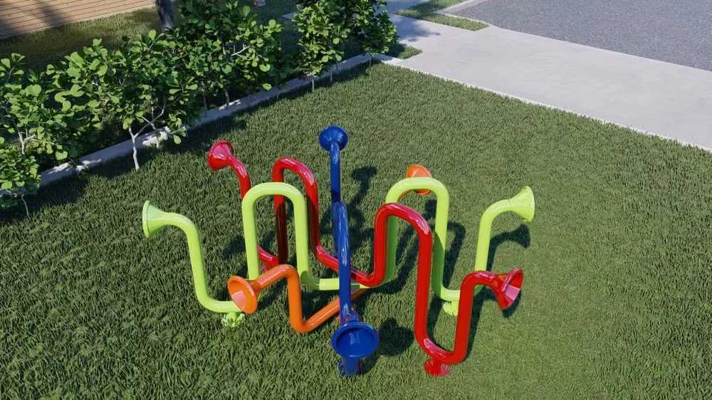 محصول امضای هنک ، لوله صحبت کردن در فضای باز بچه ها ، یک مجموعه اسباب بازی است که از چهار لوله گفتگوی مختلف و رنگی تشکیل شده است که به گروه بزرگی از کودکان اجازه می دهد تا صحبت کنند و به صدای همسالان خود گوش دهند.