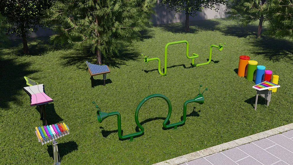 صفحه کلید رنگین کمان تجهیزات زمین بازی موسیقی در فضای باز را می توان در زمین های بازی سرپوشیده و بیرونی، زمین های بازی مدرسه یا مناطق بازی مهد کودک با دیوارهای خالی استفاده کرد. سایر سازهای کوبه ای در فضای باز نیز می توانند به صورت ترکیبی استفاده شوند.